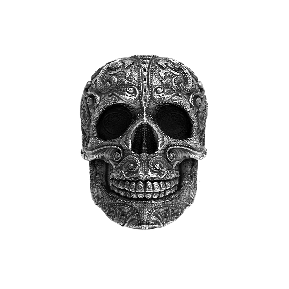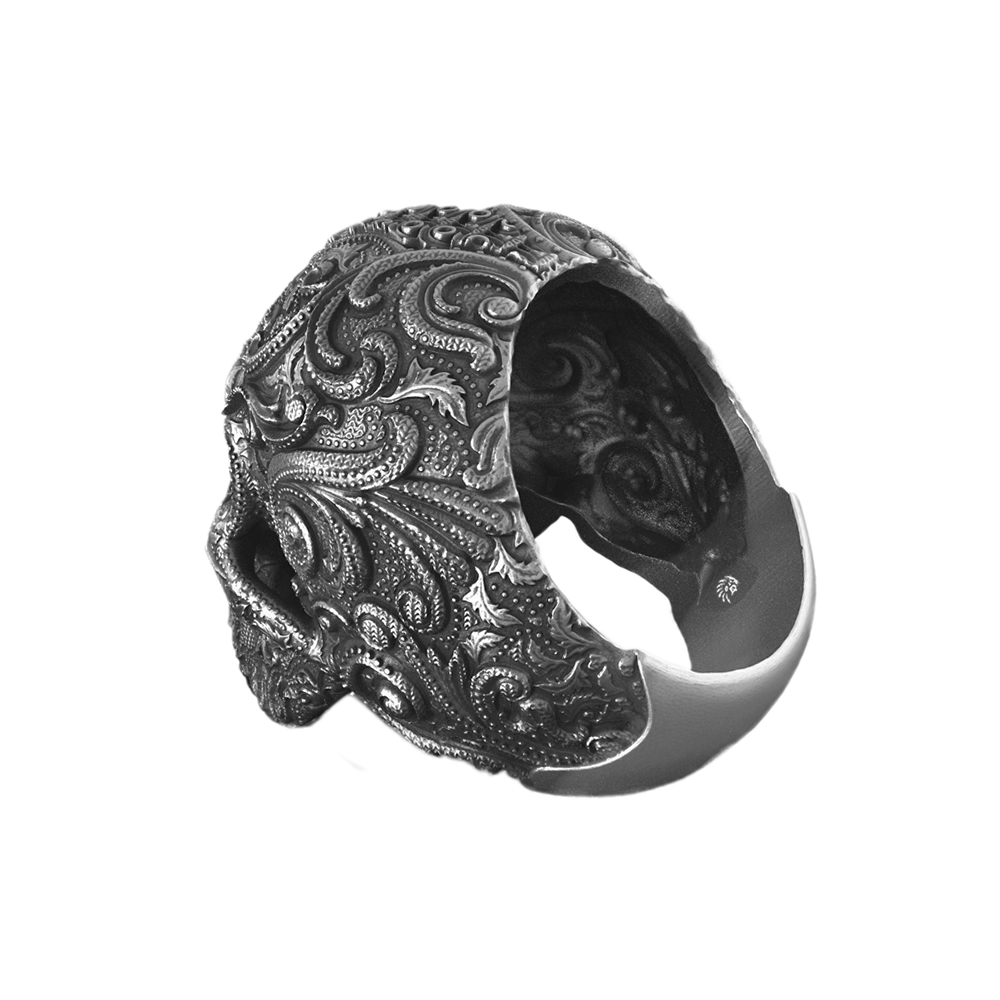 Solid Sterling Silver 950K Signet and Hallmarked (more solid sterling condent then 925) Huge and Heavy Sugar Skull with Ivy of Gothic style textured highly detailed and patterned handcrafted ring with realistic and fantastic artly detailed. App.25.5 grams, available in all ring sizes. Length of the Head top band width is app. 37.50mm. Beautiful handmade ring that you will love to wear it daily. Please pay attention to item weights because if the same item is lighter ( That is selling in some platforms or sellers ), the lighter items are either made thinner and lower quality, or they are made of a material with a different density and are coated gilded or plated with silver. Gold and Silver are minerals with high density. It is not one of the cheaply made east asian items that glass and imitation stones are selling as genuine natural diamonds and natural gemstones or plated and gildet metals are selling as Sterling or solid silver or Solid Gold. It is real genuine solid sterling silver 950K ( Nickel Free ) handcrafted artisan item.