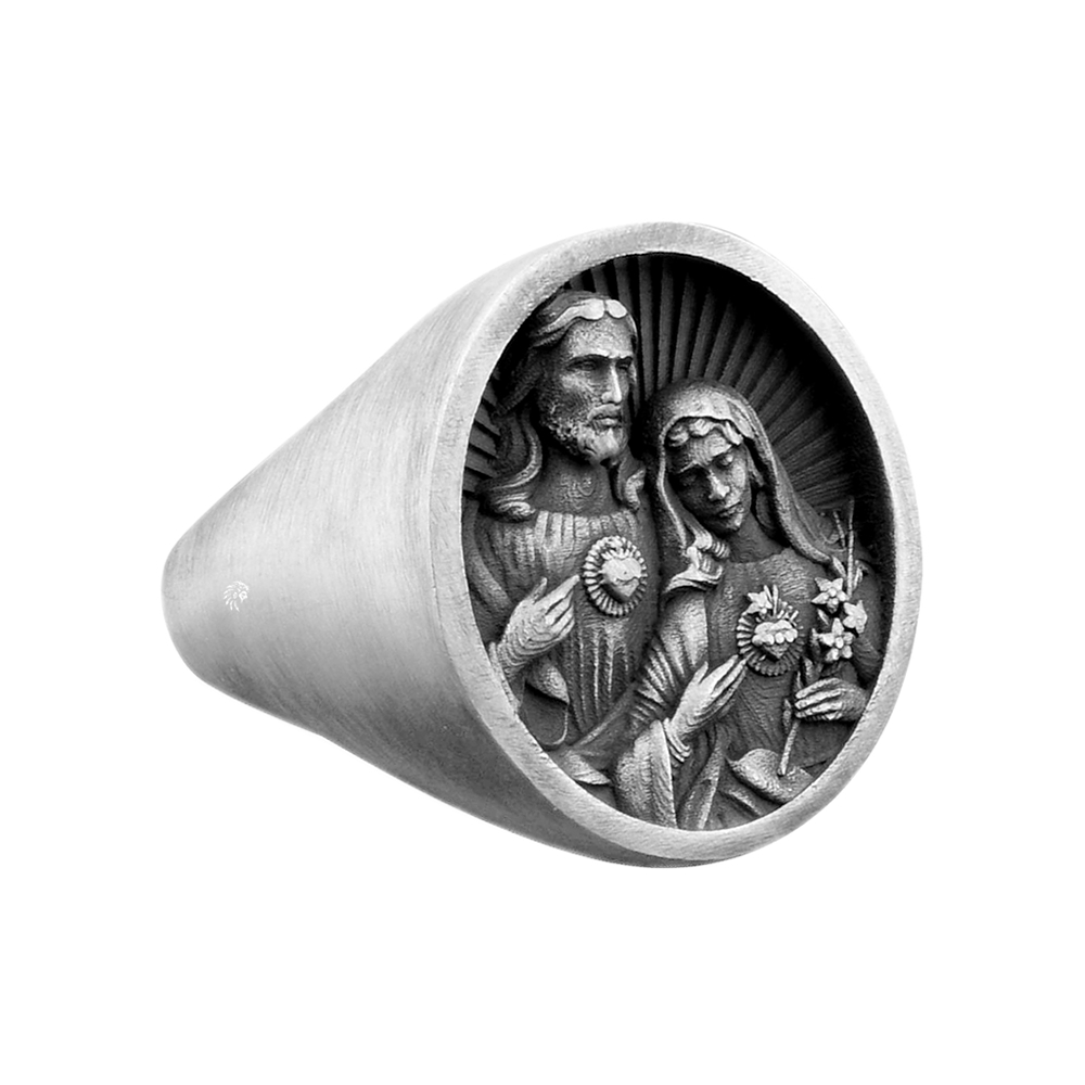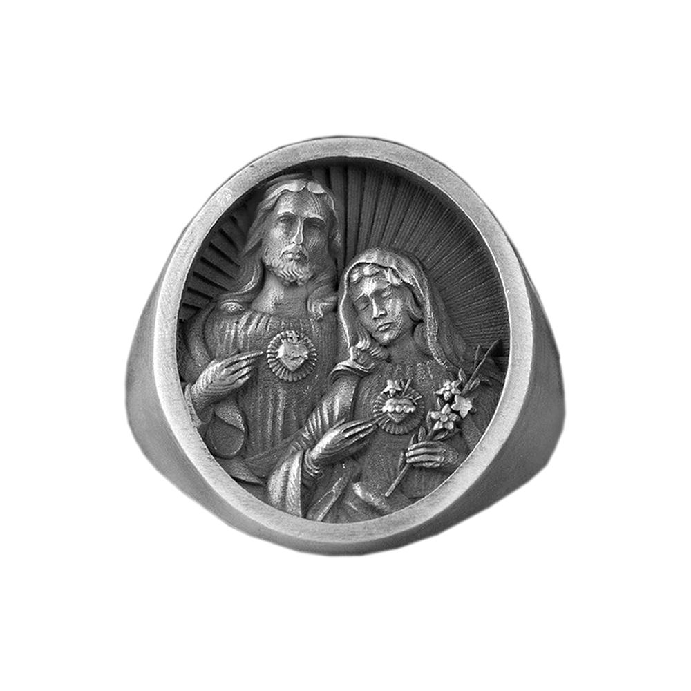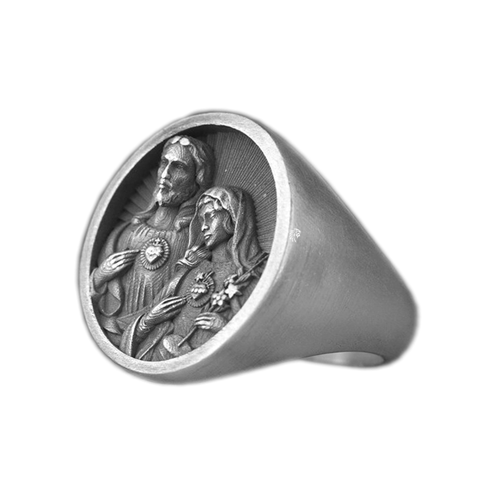 Solid Sterling Silver 950K Signet and Hallmarked (more solid sterling condent then 925) Huge and Heavy Christian’s the Sacred Heart Of Jesus with Holy Virgin Mary, Christians of Sculptures style textured highly detailed and patterned handcrafted ring, App.20.5 grams, available in all ring sizes. Length of the Head top band width is app. 24.50mm. Beautiful handmade ring that you will love to wear it daily. Please pay attention to item weights because if the same item is lighter ( That is selling in some platforms or sellers ), the lighter items are either made thinner and lower quality, or they are made of a material with a different density and are coated gilded or plated with silver. Gold and Silver are minerals with high density. It is not one of the cheaply made east asian items that glass and imitation stones are selling as genuine natural diamonds and natural gemstones or plated and gildet metals are selling as Sterling or solid silver or Solid Gold. It is real genuine solid sterling silver 950K ( Nickel Free ) handcrafted artisan item.